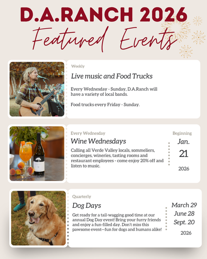 Nestled between Oak Creek and House Mountain, D.A.Ranch is a 170-acre high-desert oasis. A historic red barn with a tin roof is surrounded by green pastures, majestic old-growth trees, glimmering ponds, ripe fruit and olive orchards, and over 17 acres of estate vineyards. The D.A.Ranch brand embodies a legacy of Arizona cattle ranching culture, connecting the terroir’s rich history to the verdant present moment. Experience the natural beauty of the Page Springs wine corridor and the incredible 100% estate-grown Arizona wines from the Verde Valley AVA here at D.A.Ranch.
