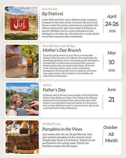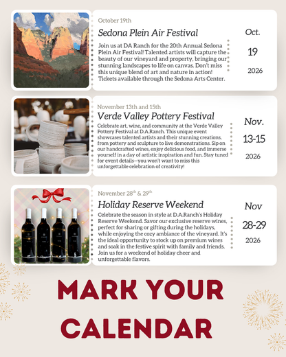 D.A.Ranch Estate Vineyards is a family-owned property nestled in the oasis of the Verde Valley AVA (American Viticultural Area). Allow our guides to share stories about the historic property, and learn what it takes to produce the highest quality wines in the desert. Meet and greet with your guide and take a walk through the vines, with an opportunity for photos as well. Explore four special wines grown on the estate while learning about our process from vine to bottle.