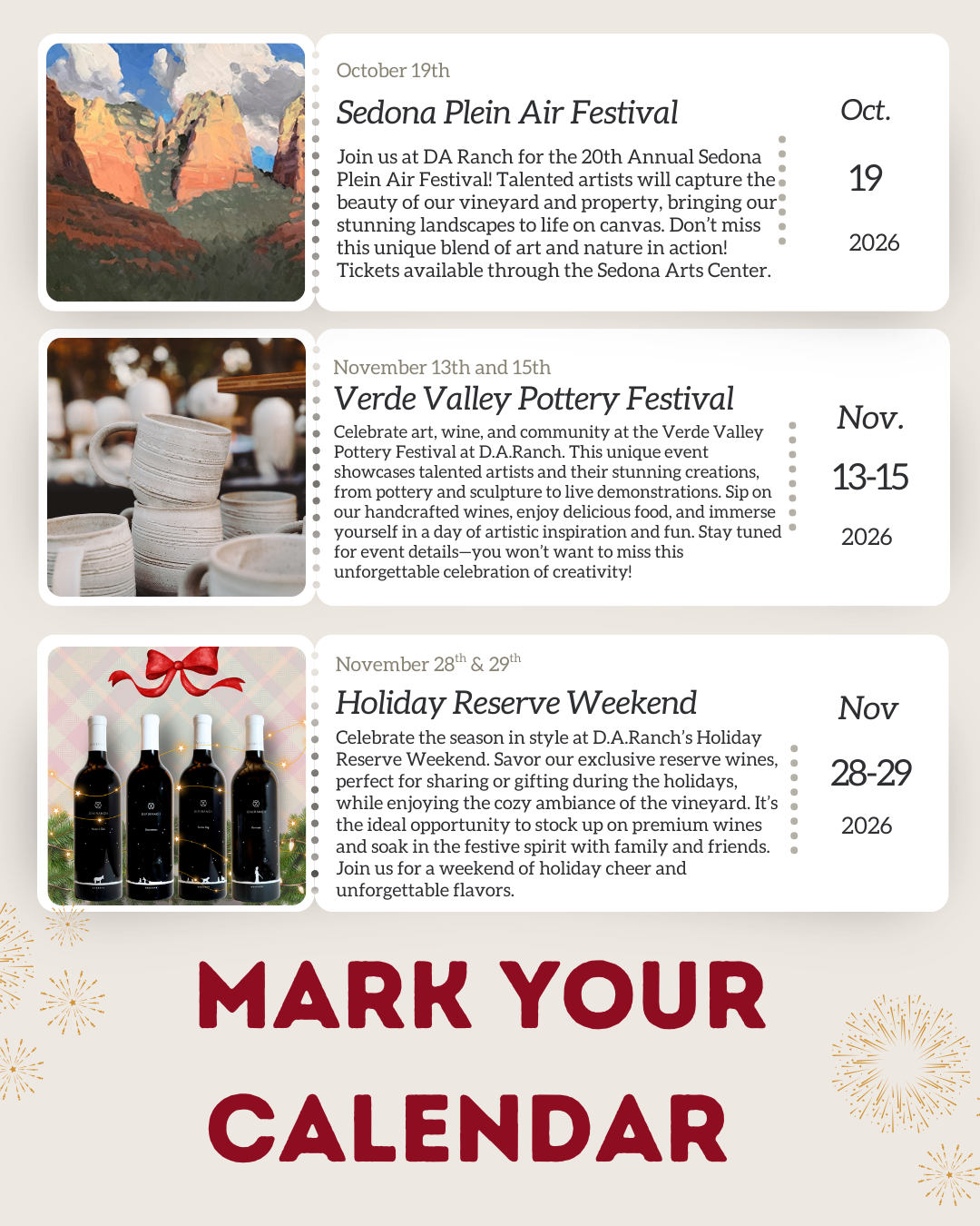 Arizona Wine Club Event: Sunday, February 1st. Join us for our first club release event of 2026. It'll be special for members and is open to the general public to attend. What a great time to inquire about the benefits of joining our estate wine club!